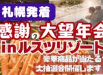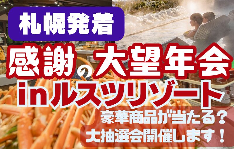 感謝を込めて2025年の大望年会をルスツリゾートで開催!人気のディナーブッフェや温泉、プロジェクションマッピング等をお楽しみいただきます。夕食後は抽選会も開催。道内ホテルペア宿泊券や日帰りバスツアー招待券もご用意!2025年の最後は大望年会で盛り上がりましょう!