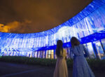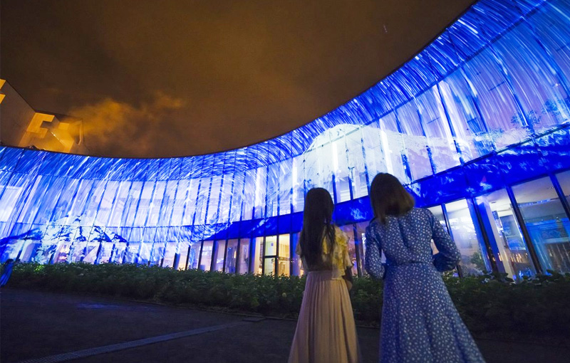ホテルの壁面の巨大ガラスへ投影するプロジェクションマッピング。アイヌの物語と音楽をベースに自然豊かな北海道を表現しています。屋外と屋内で異なる見え方で鑑賞できます(20:30からの予定)