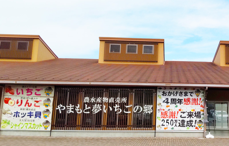 山元町農水産物直売所「やまもと夢いちごの郷」は、特産のいちごや、磯浜漁港で水揚げされたホッキ貝などの旬の味覚、採れたての野菜、バラエティーに富んだ加工品、山元ブランド認証品、地場産フルーツを使ったスイーツなどが勢ぞろいします。